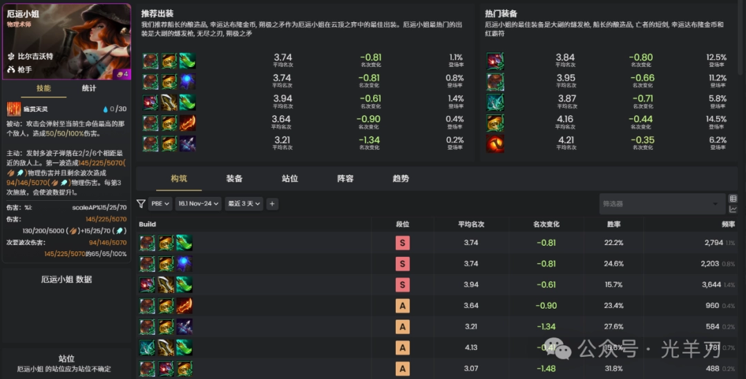 推荐船长的酿造品,幸运达布隆金币,朔极之矛作为厄运小姐在云顶之弈中的最佳出装。厄运小姐最热门的装是大副的燃发枪,无尽之刃,朔极之矛