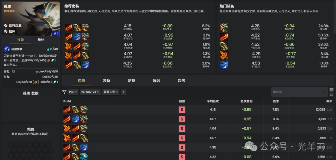 推荐鬼索的狂暴之刃,无尽之刃,海妖之怒作为薇恩在云顶之弈中的最佳出装。这也是薇恩最热门的出装。