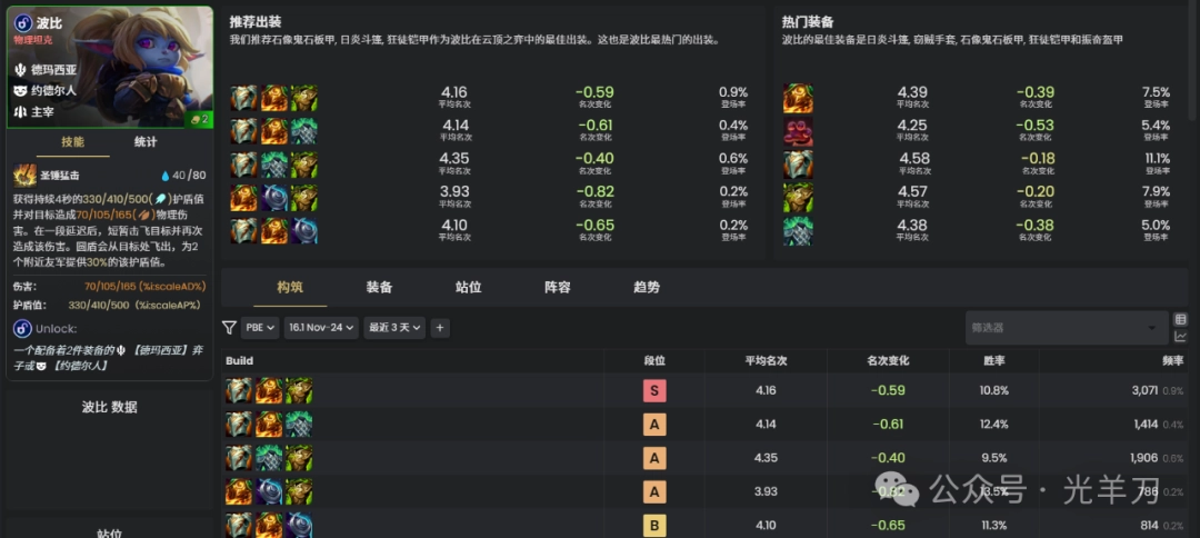 推荐石像鬼石板甲,日炎斗篷,狂徒铠甲作为波比在云顶之弈中的最佳出装。这也是波比最热门的出装。