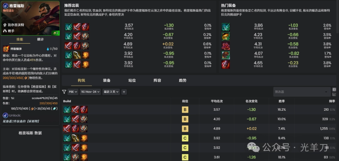推荐亡者的短剑饮血剑斯特拉克的挑战护手作为格雷福斯在云顶之弈中的最佳出装。格雷福斯最热门的出装是饮血剑,斯特拉克的挑战护手,泰坦的坚决