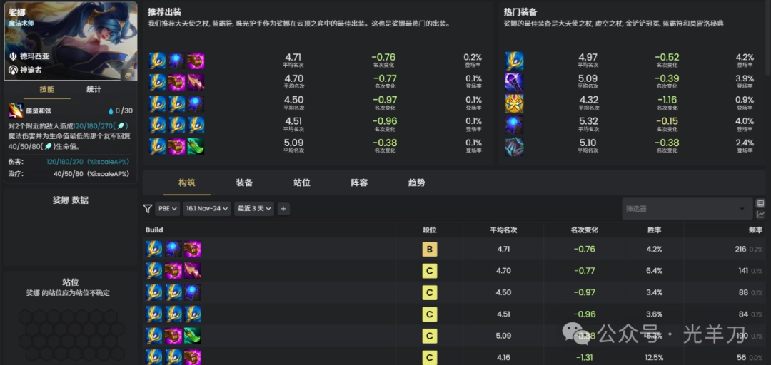 推荐大天使之杖,蓝霸符,珠光护手作为娑娜在云顶之弈中的最佳出装。这也是娑娜最热门的出装。