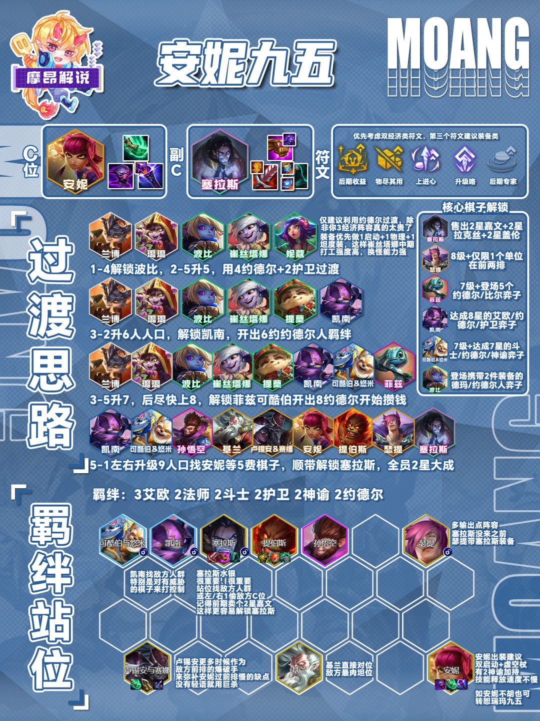 云顶之弈S16版本英雄联盟传奇主题,在新赛季会增加很多新的羁绊和棋子,还有不少老羁绊,老英雄的回归,那么有不少小伙伴好奇新赛季有什么强力阵容,下面就给大家带来s16安妮九五阵容推荐。