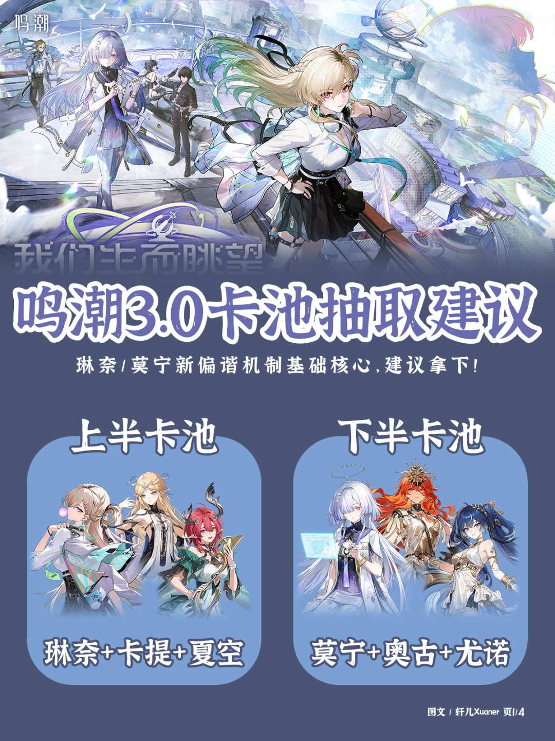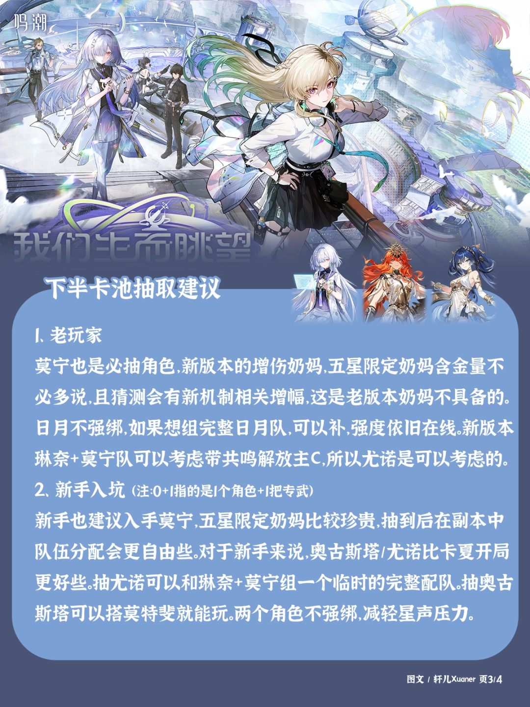 ② 老漂:依旧根据自己卡池决定。建议优先把琳奈和莫宁拿下后,再去考虑补角色。琳奈和莫宁是新机制的当前版本核心,各种副本环境应该会有不错的加成,抽到后玩的会更舒适些。补角色的话,如果有卡提,需要补一只00夏空。如果有奥古斯塔或尤诺,可补可不补。尤诺可以跟琳奈莫宁搭。奥古斯塔用莫特斐也可以。根据自己的星声来。后续版本可能会出新的主C,3.0的两个角色一个副C、一个奶妈。所以也可以预留一点星声给后续版本。