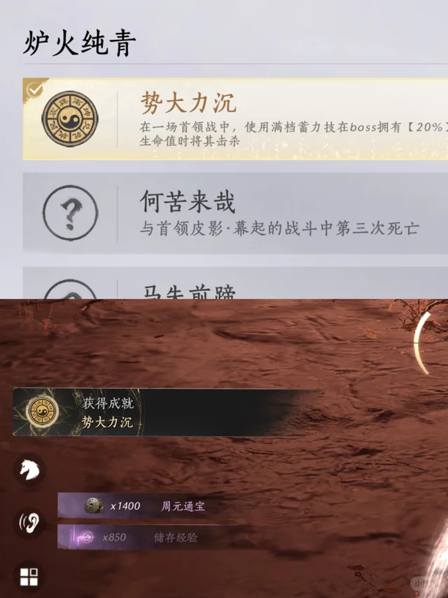 达成要点:使用任意武学满档蓄力技能,将至少有20%生命值的首领击杀