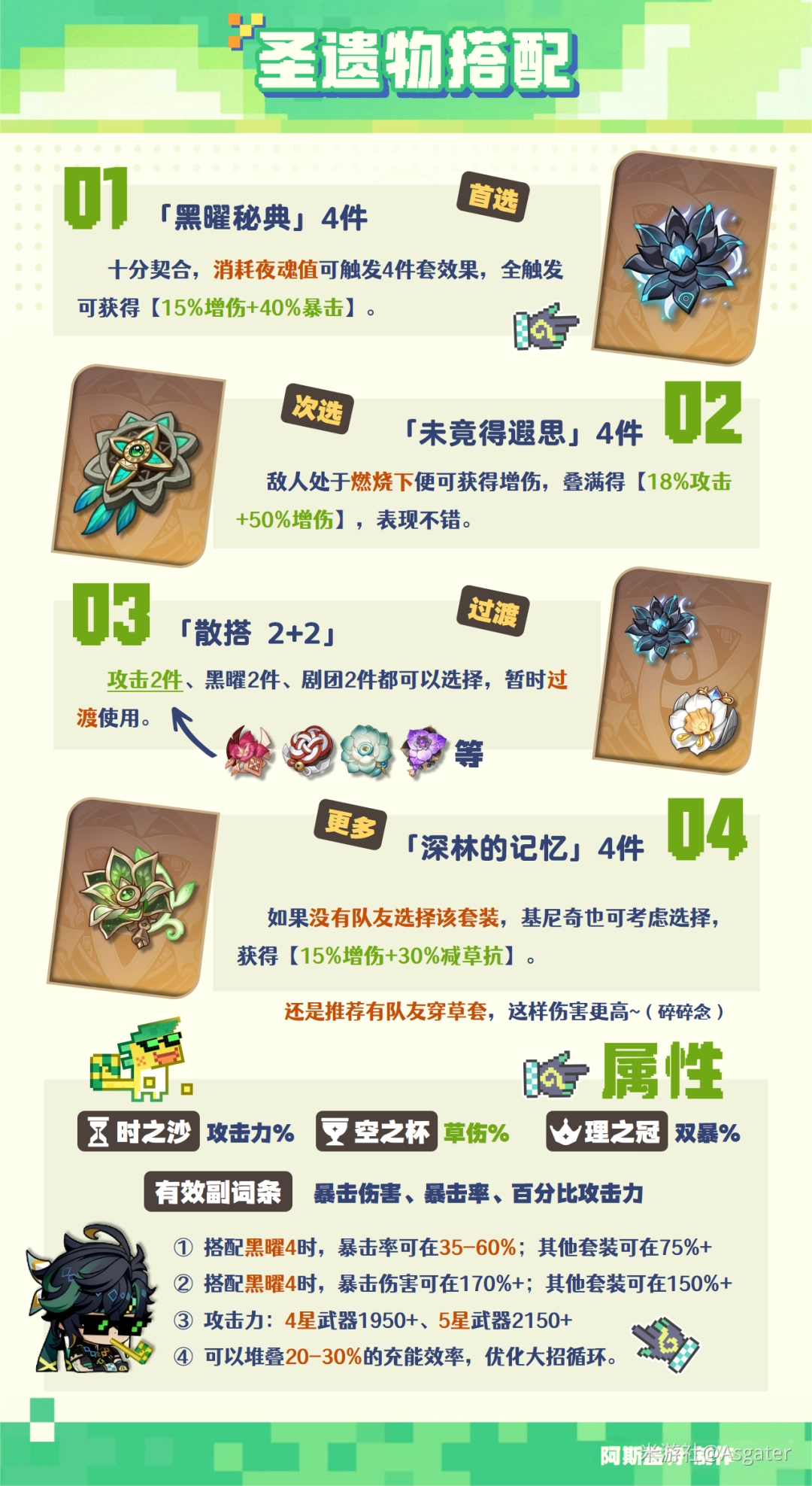 ② 只有在没有黑曜/未竟/深林三者中的任何一种4件套时,才考虑剧团4(且为优秀词条,否则推荐先刷黑曜4)。