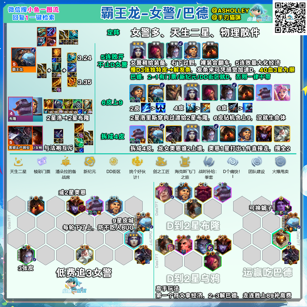 不追3吃巴德(图右):由手刃猫咪提供,经济城邦/经济符文2-3解巴德,运营上89,巴德合到2星(提供6点回蓝)这样会比吃3星女警少6点回蓝,所以得补出相应的高费外援,有2条推荐的路线,一个是嫖到2星布隆/1星奥恩,一个是蔚妮蔻乌鸦组合上限塞拉斯