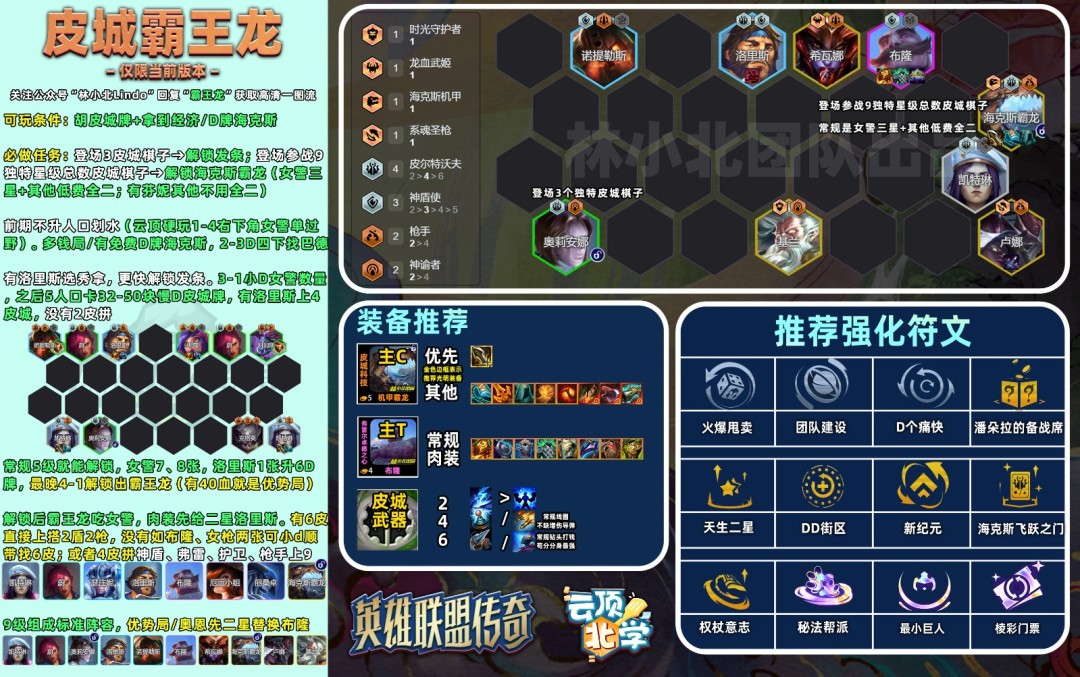 主线必做任务:登场女警、蔚、洛里斯/芬妮→解锁发条;登场参战9独特星级总数皮城棋子→解锁海克斯霸龙(通常是三星女警+2、3费全二星,有芬妮2、3费有一个不用二星)