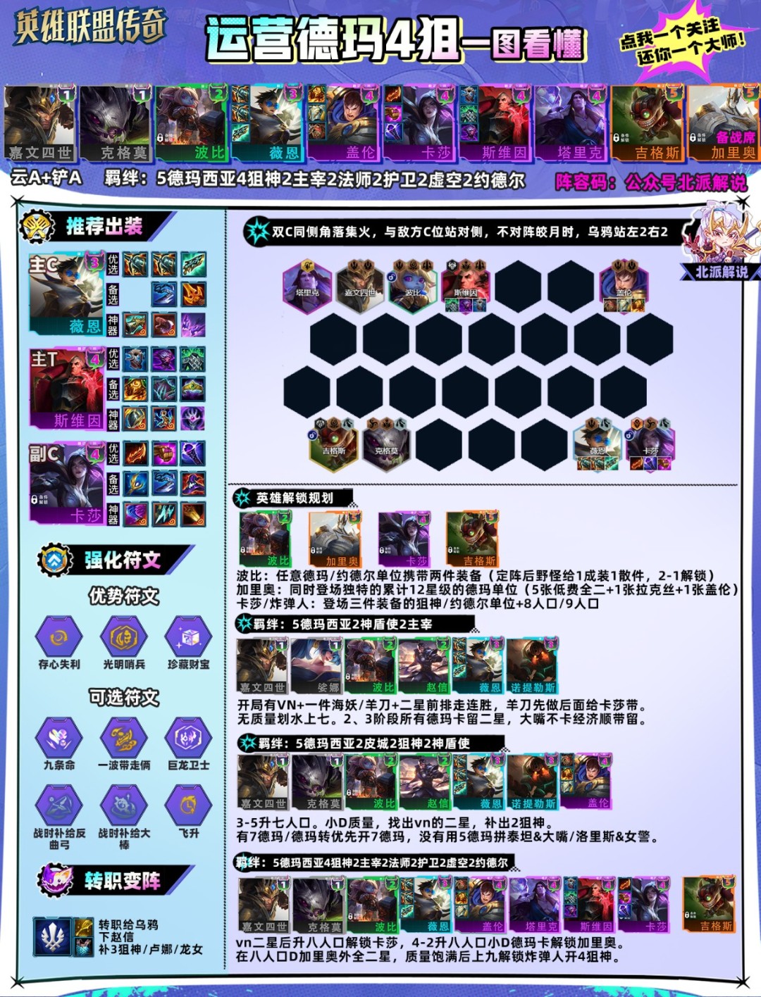 云顶之弈S16版本英雄联盟传奇主题,在新赛季会增加很多新的羁绊和棋子,还有不少老羁绊,老英雄的回归,那么有不少小伙伴好奇新赛季有什么强力阵容,下面就给大家带来s16运营德玛4狙阵容推荐。
