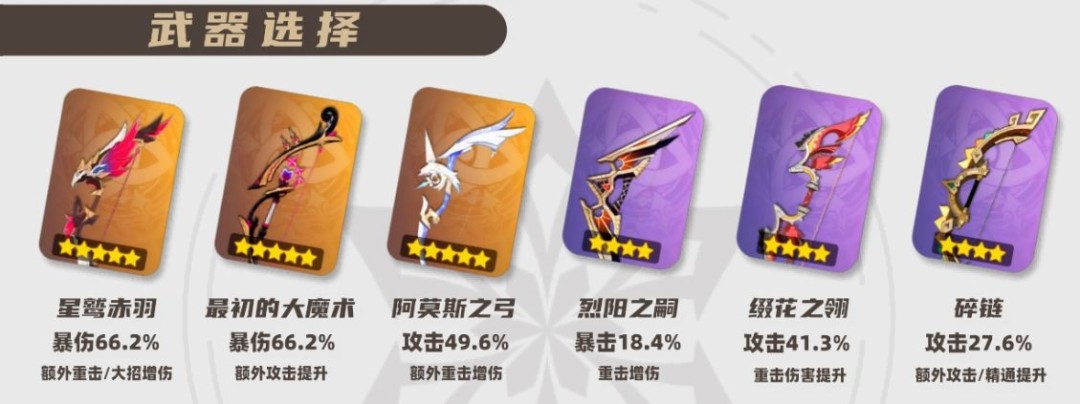 ③.冻结玩法搭配「冰封迷途的勇士(冰风套)」4件时可优先考虑副属性为攻击力、暴击伤害的武器,如阿莫斯之弓、若水、试做澹月、破魔之弓等。
