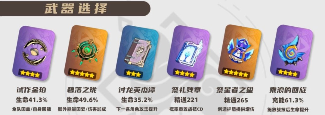 优先提高需求的元素充能效率大多数情况下,0命的高性价比武器可选择高精练的「试作金珀」,优化能量循环的同时提高白术的治疗量。想进一步优化白术的能量循环可以考虑选择碧落之珑。