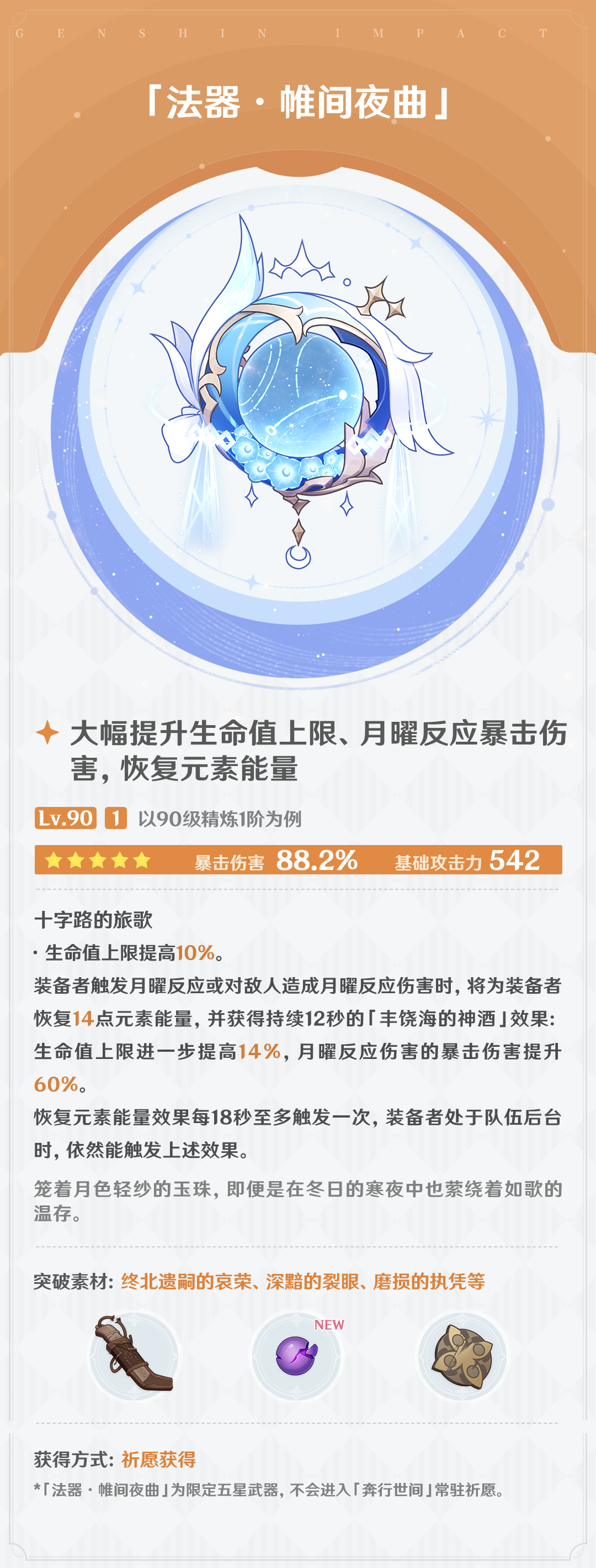 旅行者好!今天将为大家介绍「月之四」版本中的全新武器,一起来看看吧~