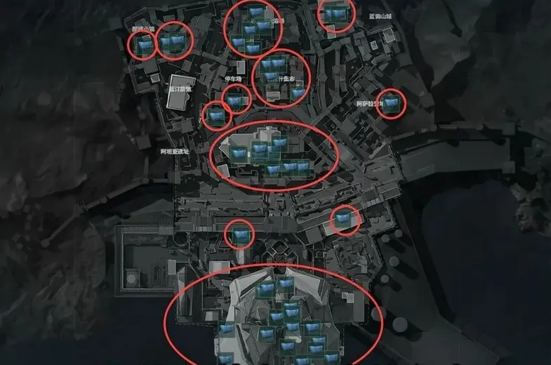 巴克什 (超高密度区 - 约47个点):城市巷战图,点位极多且集中于室内和复杂街巷,如博物馆内部、长廊、集市摊位下方、浴场等。