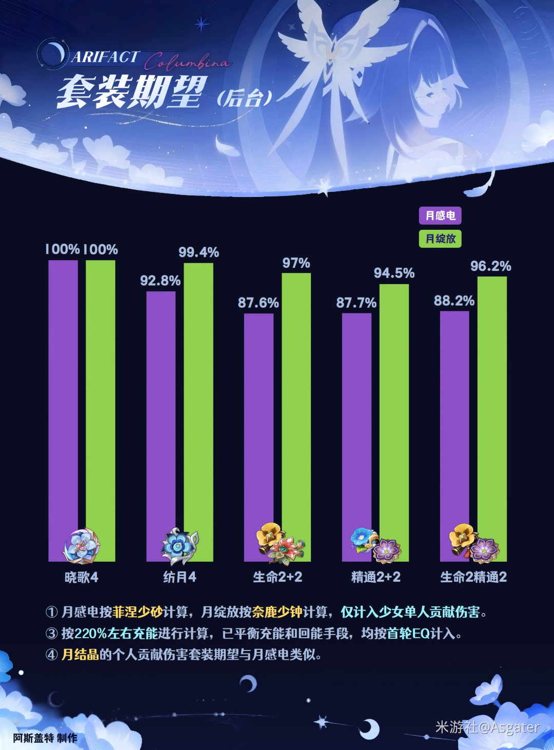 ② 月绽放队中,优先确保充能足够,推荐220%+或更高。