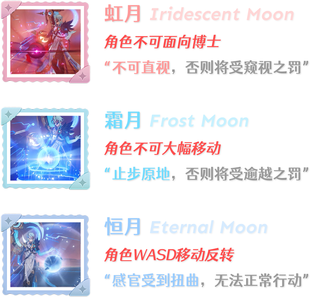 霜月:角色不能进行大幅度移动;这包括角色被各种伤害打飞;