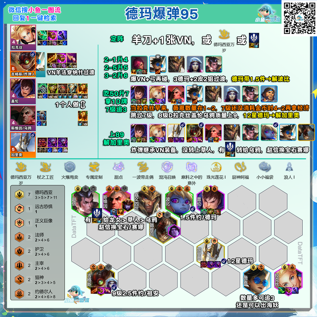 云顶之弈S16版本英雄联盟传奇主题,在新赛季会增加很多新的羁绊和棋子,就在最近云顶之弈也进行了部分调整,那么有不少小伙伴好奇有什么新阵容,下面就给大家带来德玛爆蛋95阵容推荐。