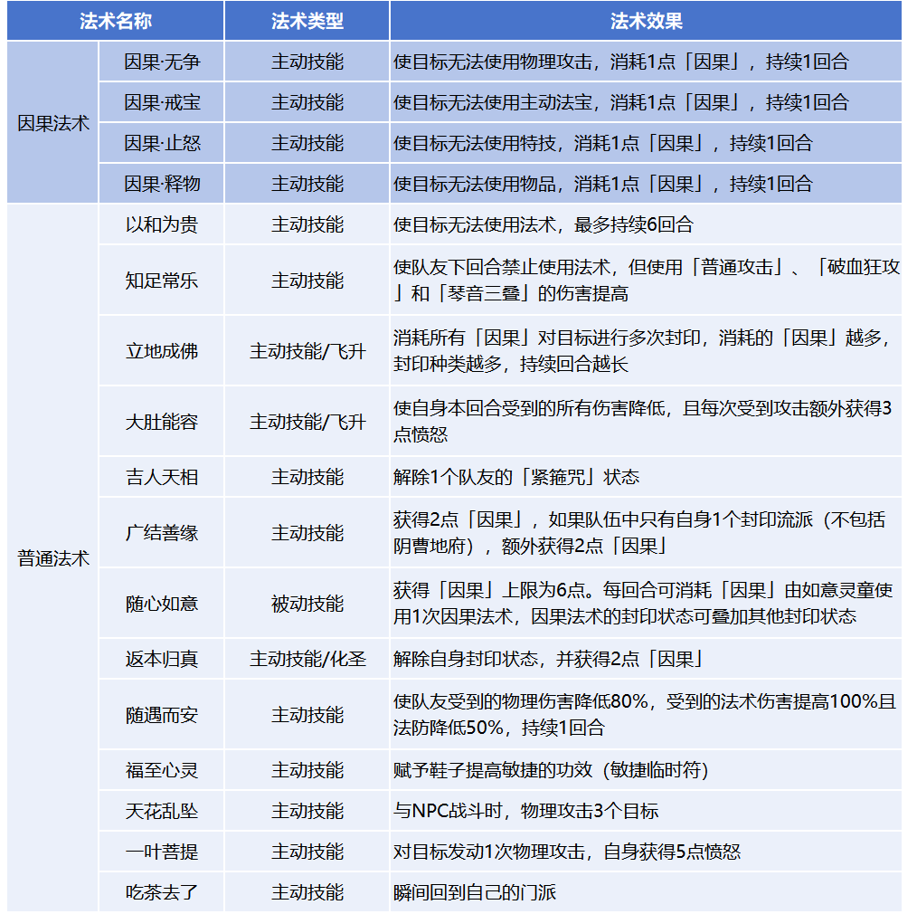 1.被动技能「随心如意」只有在自身拥有「因果」的情况下才会生效。并且,使用「因果法术」时并不会消耗自身行动机会,也就是说弥勒山弟子们可以在不触发奇袭法术的情况下,一回合就能行动2次。