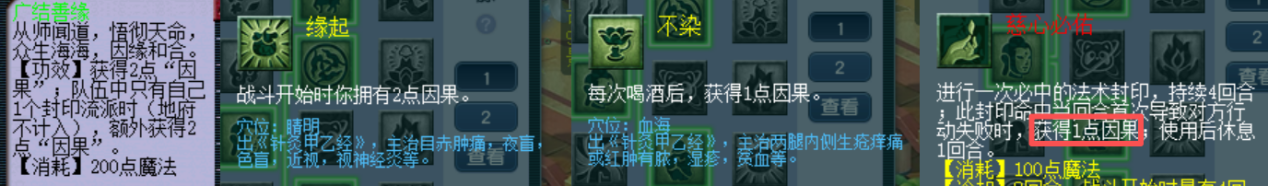 3.使用「因果法术」需要消耗的「因果」可通过师门法术「广结善缘」、经脉技能「不染」、「缘起」以及经脉大招「慈心必佑」等途径获得。