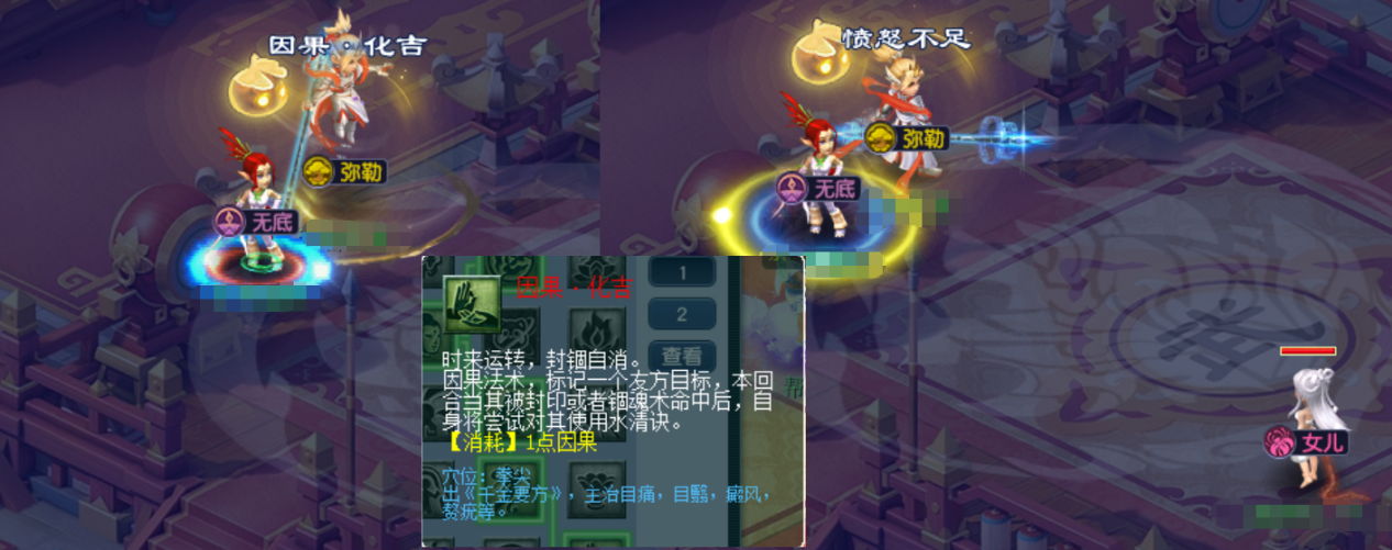 「因果·化吉」被动触发的「水清诀」需要玩家携带水清诀特技,且依然需要消耗自身愤怒,当自身愤怒不足的时候,「因果·化吉」将无法利用「水清诀」被动解除本回合可能遭遇的封印法术或锢魂术。