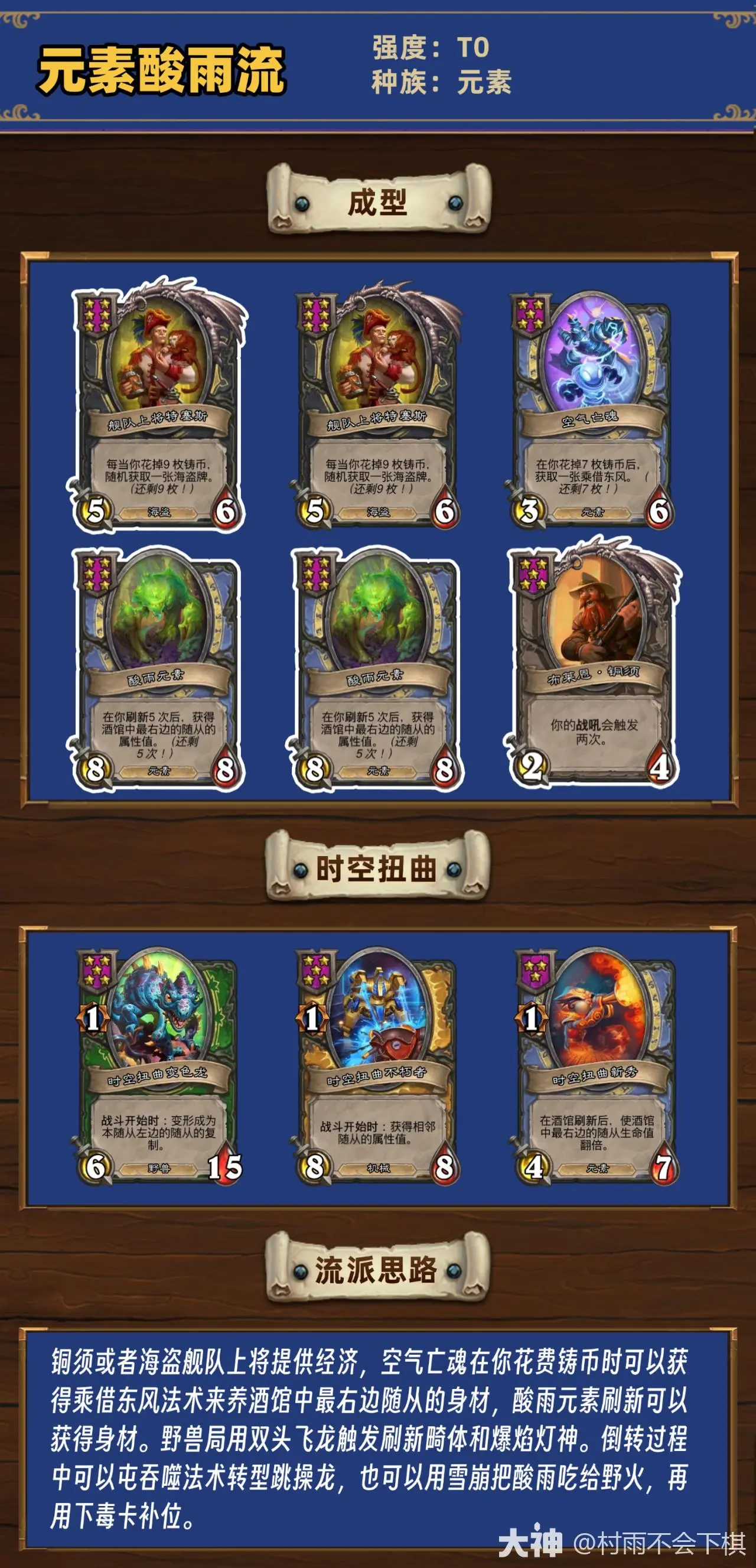铜须或者海盗舰队上将提供经济,空气亡魂在你花费铸币时可以获得乘借东风法术来养酒馆中最右边随从的身材,酸雨元素刷新可以获得身材。野兽局用双头飞龙触发刷新畸体和爆焰灯神。倒转过程中可以屯吞噬法术转型跳操龙,也可以用雪崩把酸雨吃给野火,再用下毒卡补位。