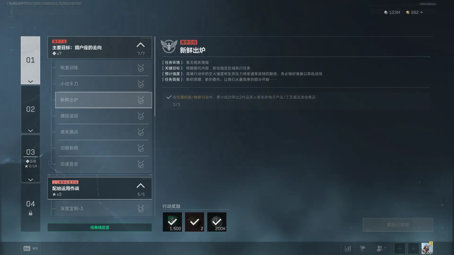 1、任务目标:在任意机密/绝密行动中,累计成功带出3件品质≥紫色的电子产品/工艺藏品类收集品。