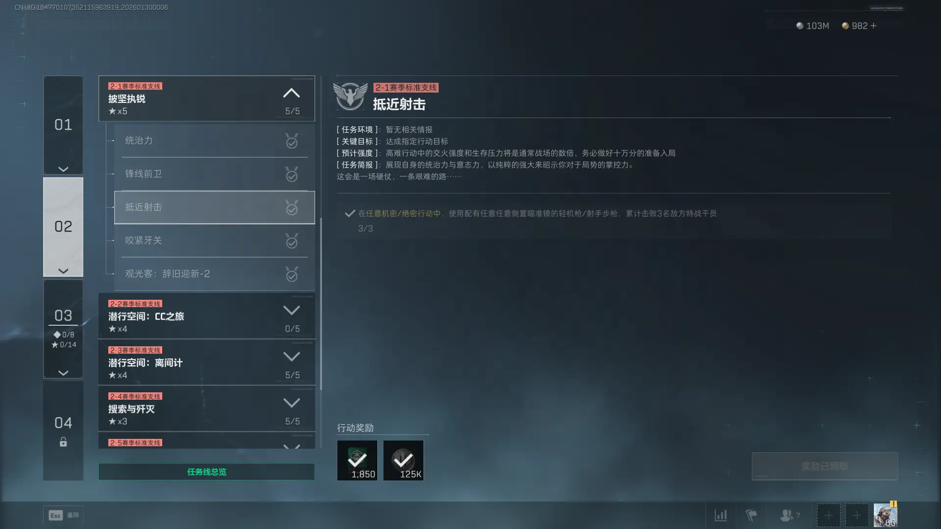 1、任务目标:在任意机密/绝密行动中,使用配有任意任意侧置瞄准镜的轻机枪/射手步枪,累计击败3名敌方特战干员。