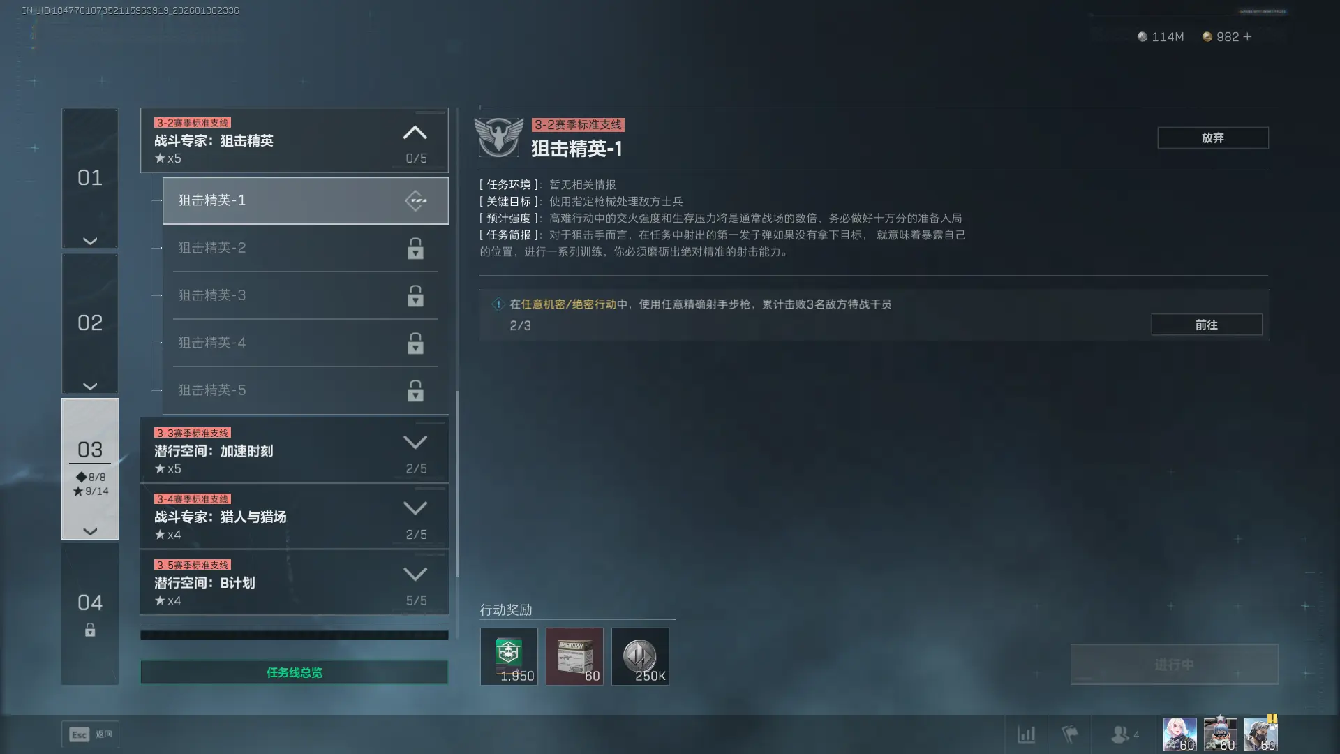 1、任务目标:在任意机密/绝密行动中,使用任意精确射手步枪,累计击败3名敌方特战干员。
