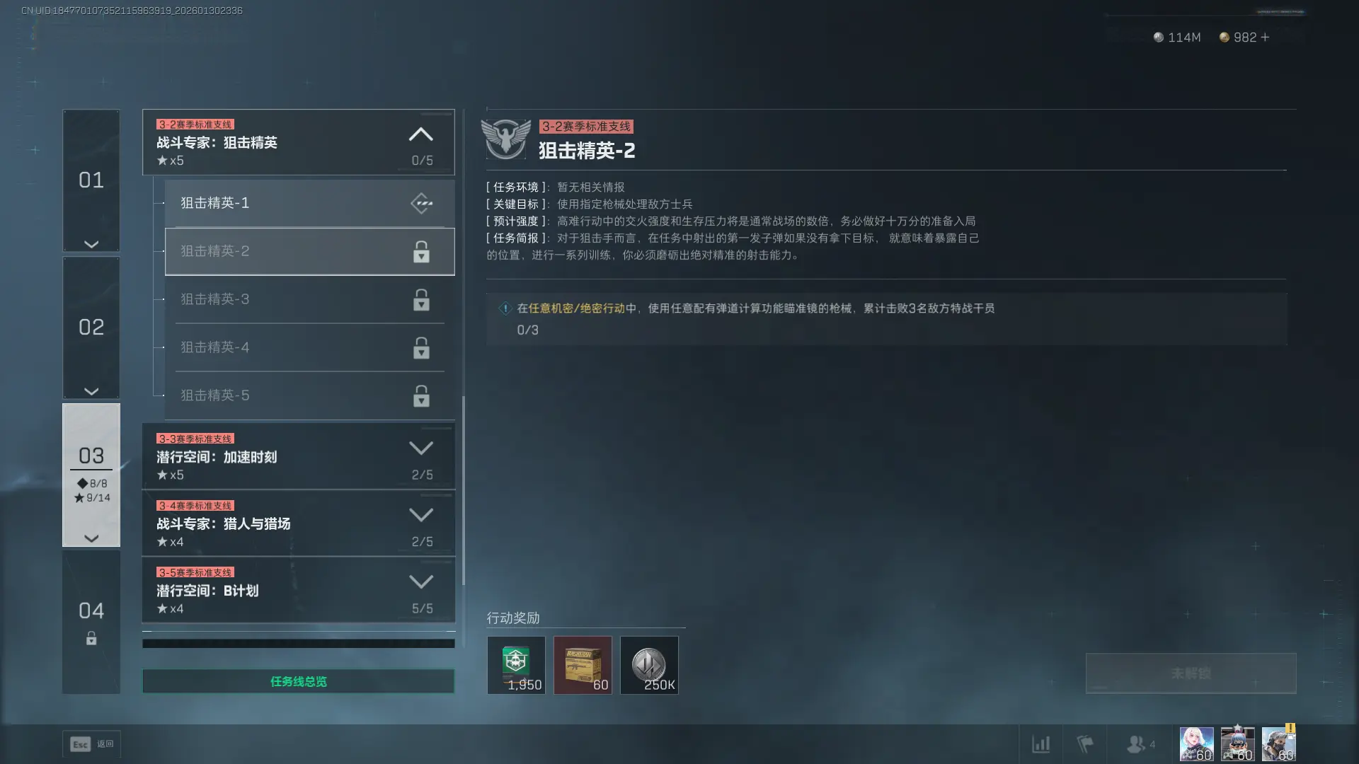使用任意精确射手步枪,累计击败3名敌方特战干员;2.使用任意配有弹道计算功能瞄准镜的枪械,累计击败3名敌方特战干员;3.使用任意配备5级及以上7.62x54R/7.62x51弹药的武器,累计击败3名敌方特战干员。