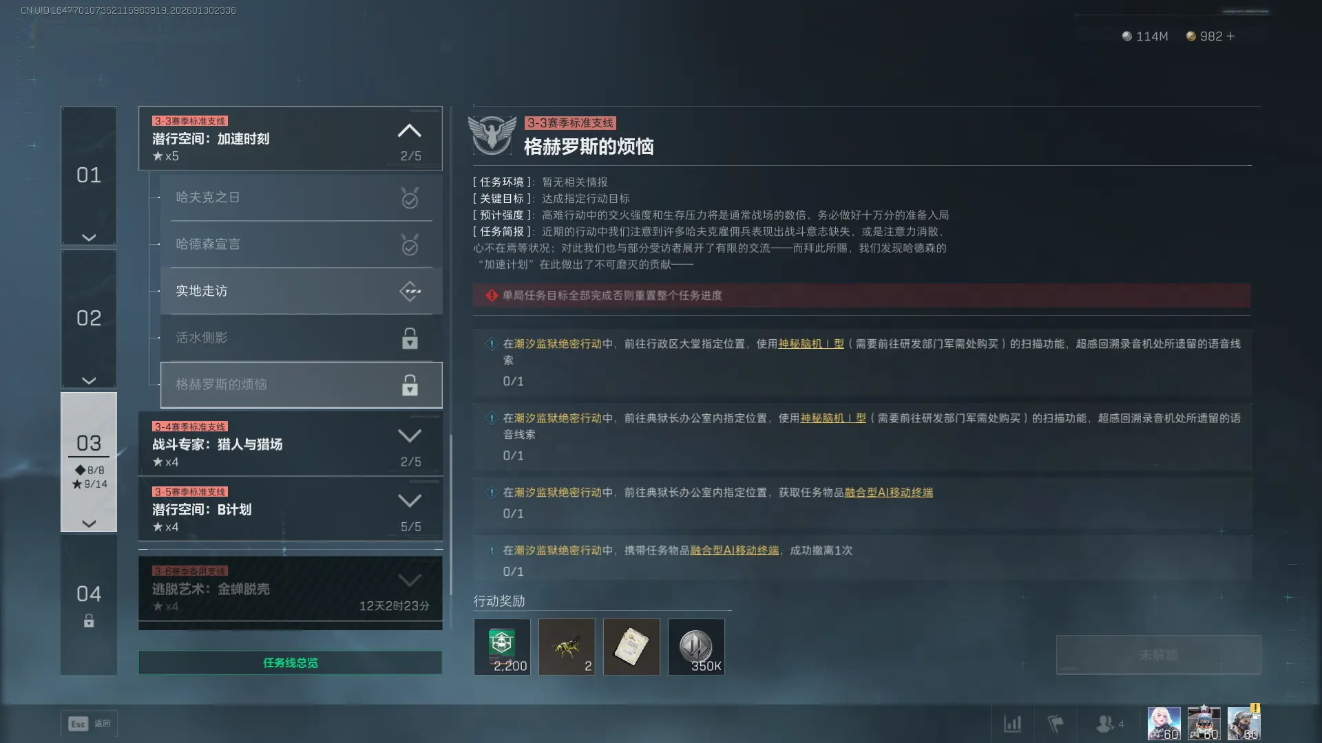 4、任务奖励:经验x2200、机械工蜂模型x2、赛季任务定制装备券x1、哈夫币x350000