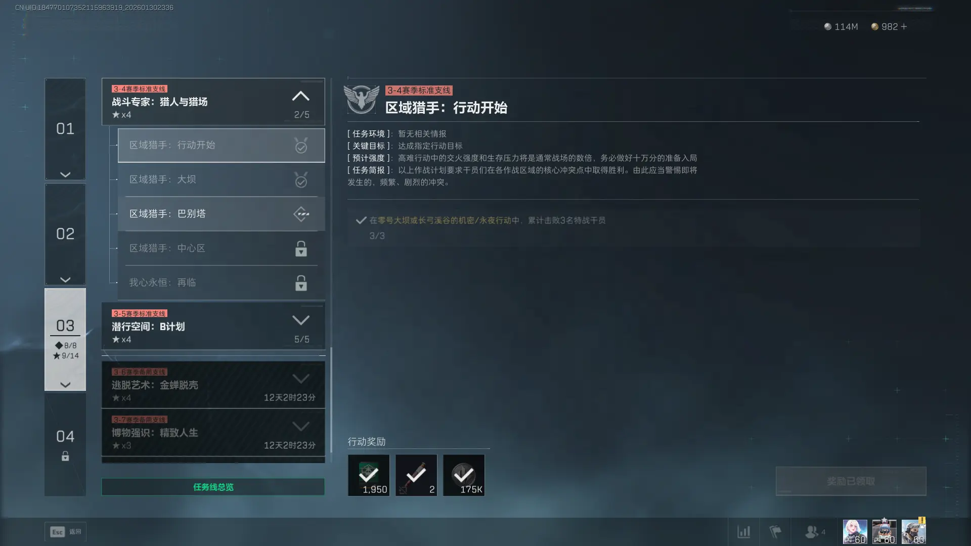 1、任务目标:在零号大坝或长弓溪谷的机密/永夜行动中,累计击败3名特战干员。