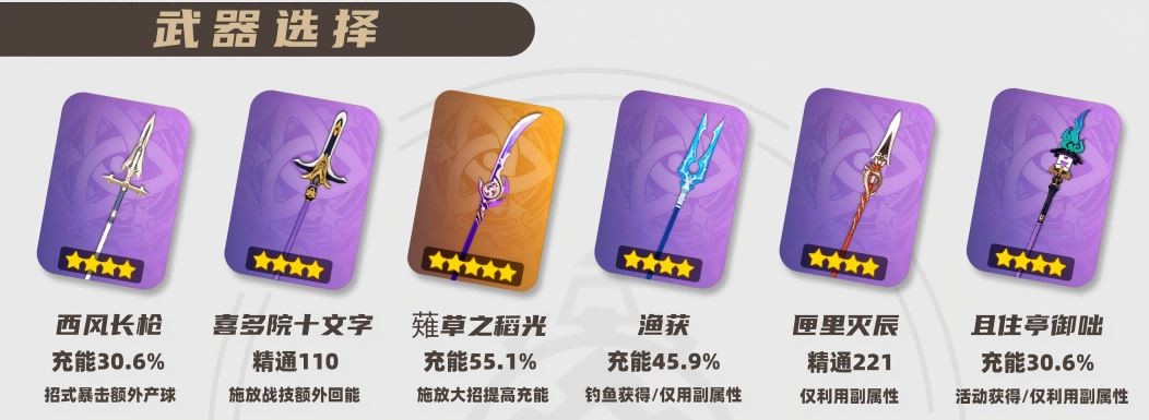 【0命叶洛亚】推荐前2把武器,充能压力相对小许多。西风长枪考虑带个暴击头触发武器效果,喜多院十文字则需6秒回能叶洛亚得先战技起手。