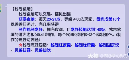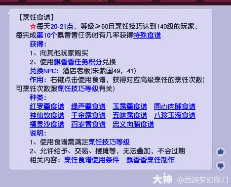 秘制食谱概率:每日20:00-21:00期间,烹饪技能≥140级的玩家在完成第10次任务时,有概率额外获得秘制食谱,这类食谱可制作更高级的烹饪物品。