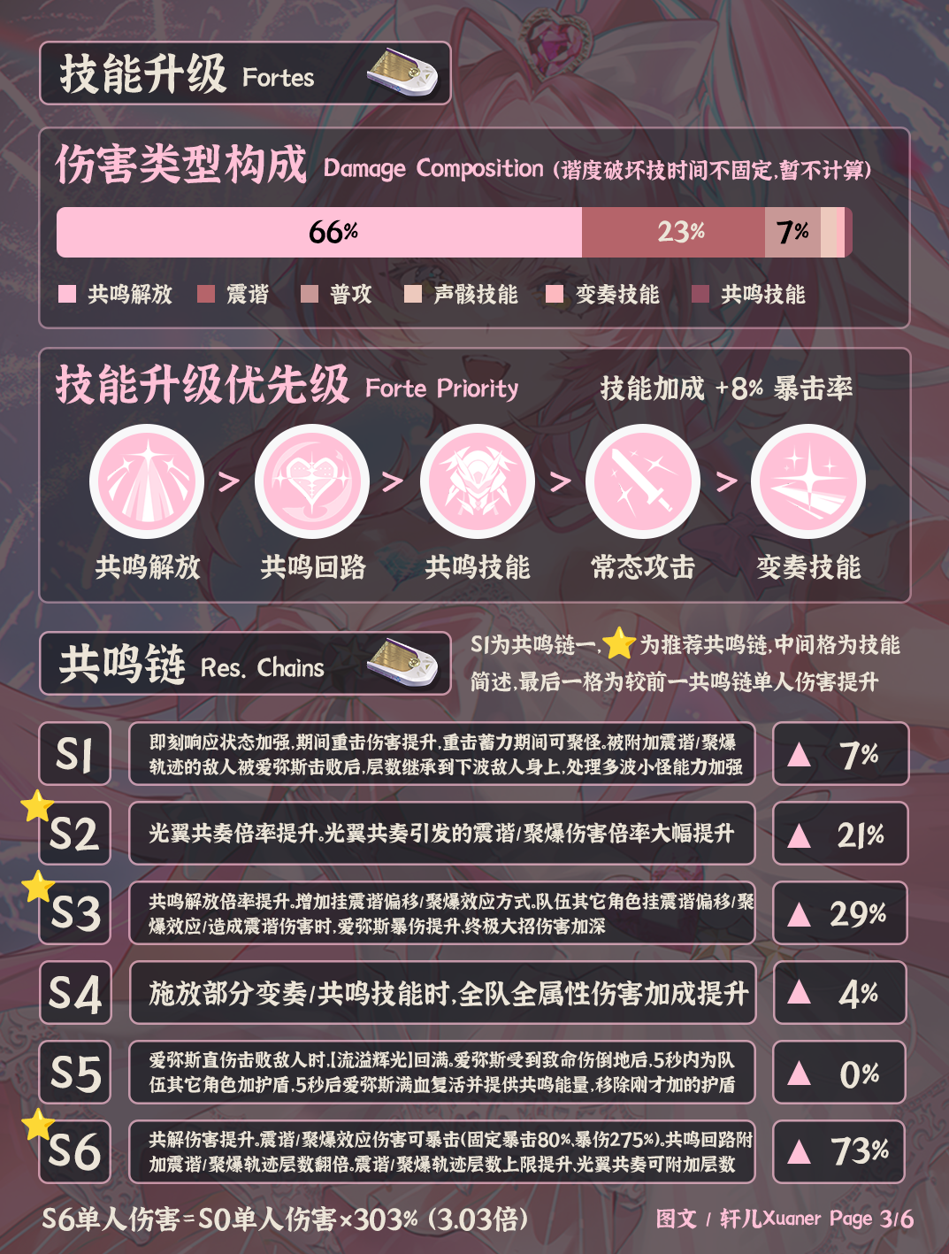 ③ 爱弥斯主要输出类型为共鸣解放伤害。共鸣链推荐抽取2/3/6链。2链提升伤害倍率。3链偏解绑队友,提升个人伤害倍率,增加挂震谐/聚爆方式。6链伤害大幅提升,震谐/聚爆轨迹层数上限提升,并且挂震谐/聚爆速度更快,震谐/聚爆伤害可以暴击。