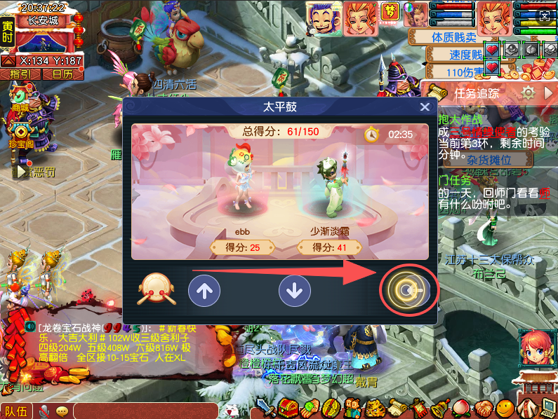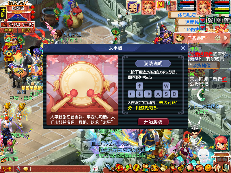 3、太平鼓(按键):按下鼓点对应的方向按键,即可踩中鼓点。在限定时间内,双方累计达到150分即通关,未达到150分即失败。