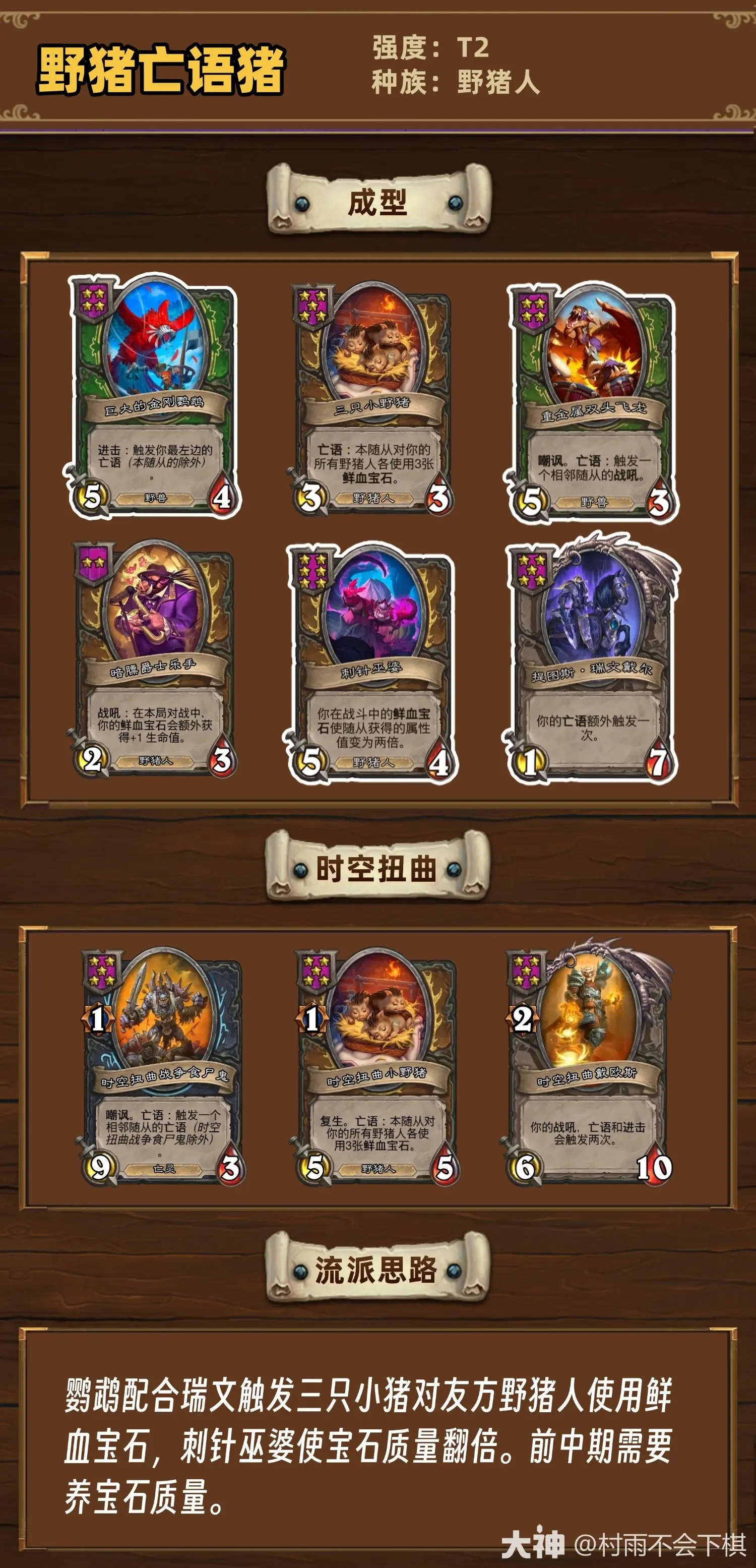 鹦鹉配合瑞文触发三只小猪对友方野猪人使用鲜血宝石,刺针巫婆使宝石质量翻倍。前中期需要养宝石质量。