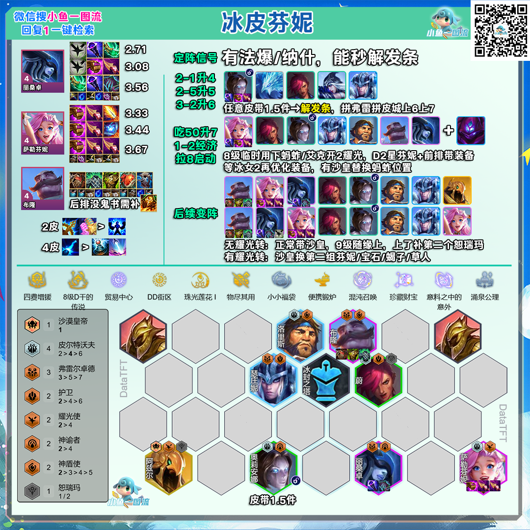 云顶之弈S16版本英雄联盟传奇主题,在新赛季会增加很多新的羁绊和棋子,还有不少老羁绊,老英雄的回归,那么有不少小伙伴好奇新赛季有什么强力阵容,下面就给大家带来s16冰皮芬妮阵容推荐。