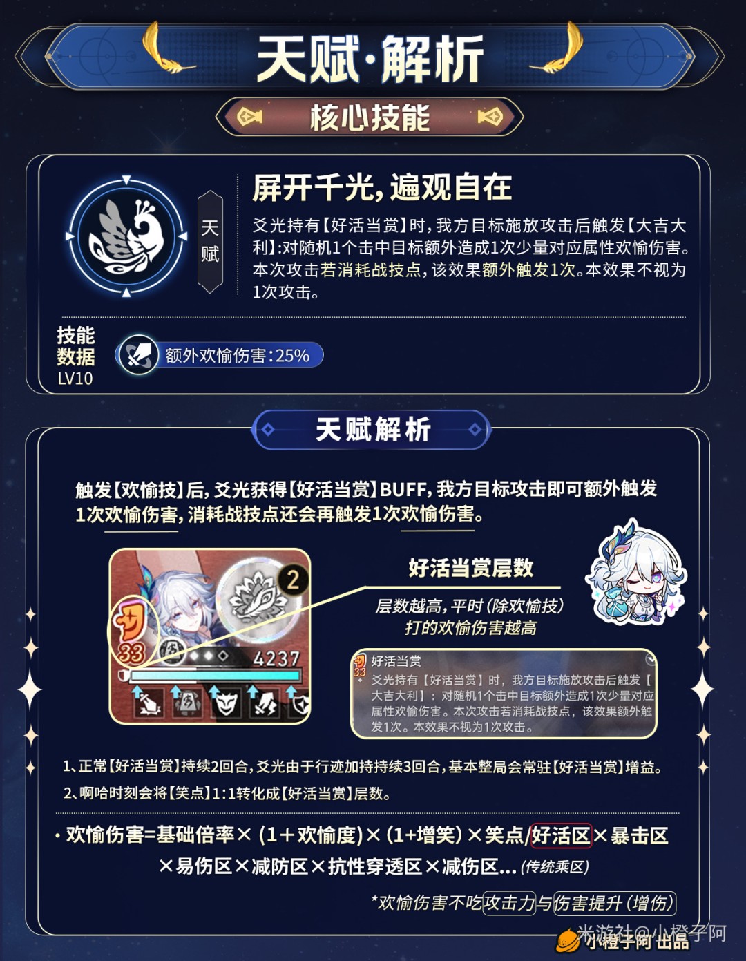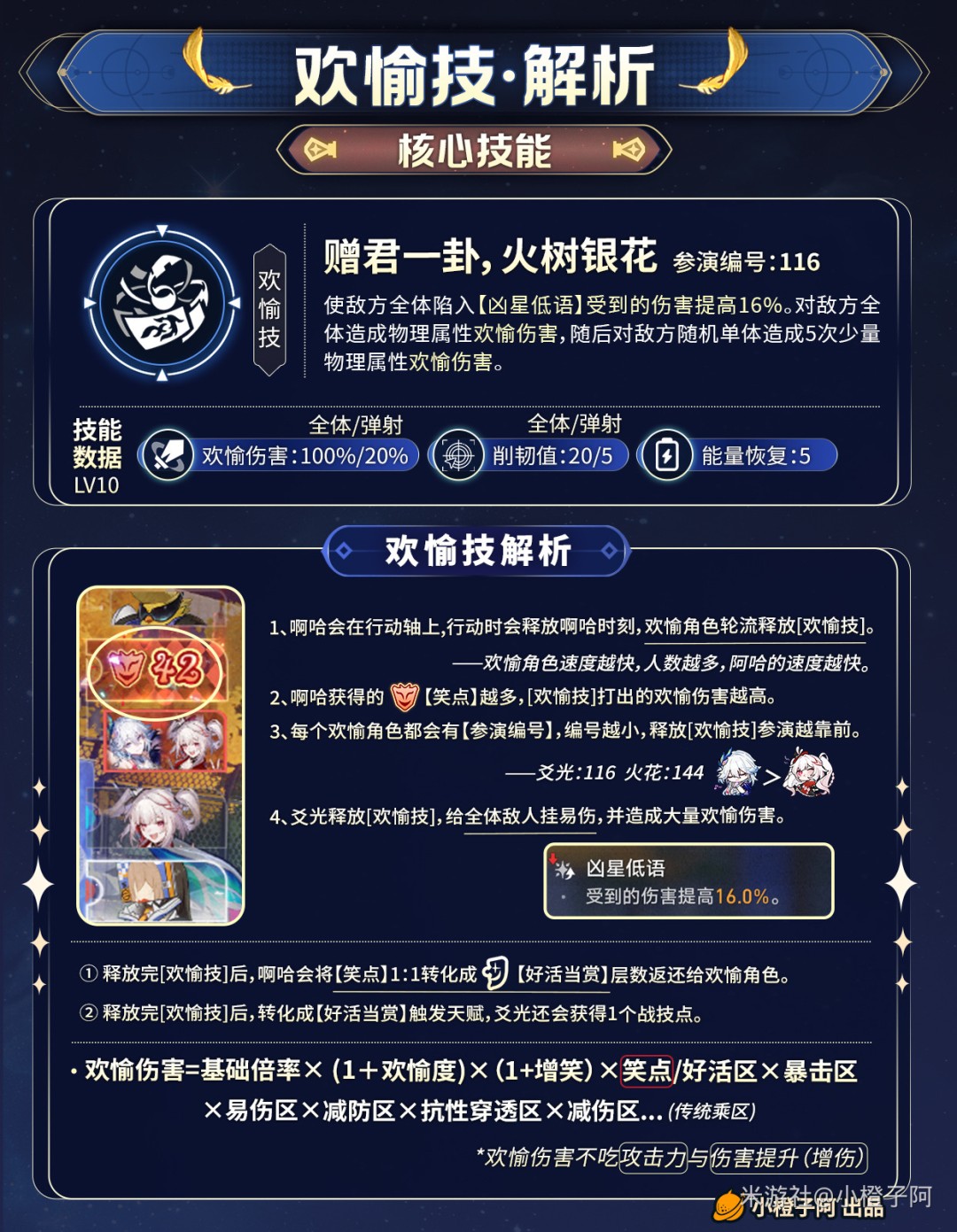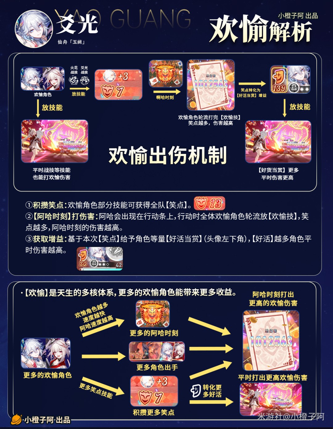 以【笑点】为核心,星神亲自带领全体欢愉角色一起打伤害的体系,人越多越欢愉,是天生的多核体系。