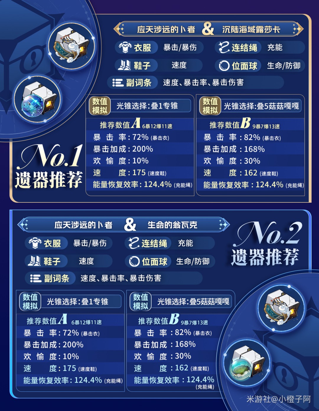 ①外圈遗器推荐新遗器【应天涉远的卜者】,二件套速度加成,四件套则是速度达到120/160,使装备者的暴击率提高10%/18%,也就是说,爻光速度至少要达到160吃满暴击加成;