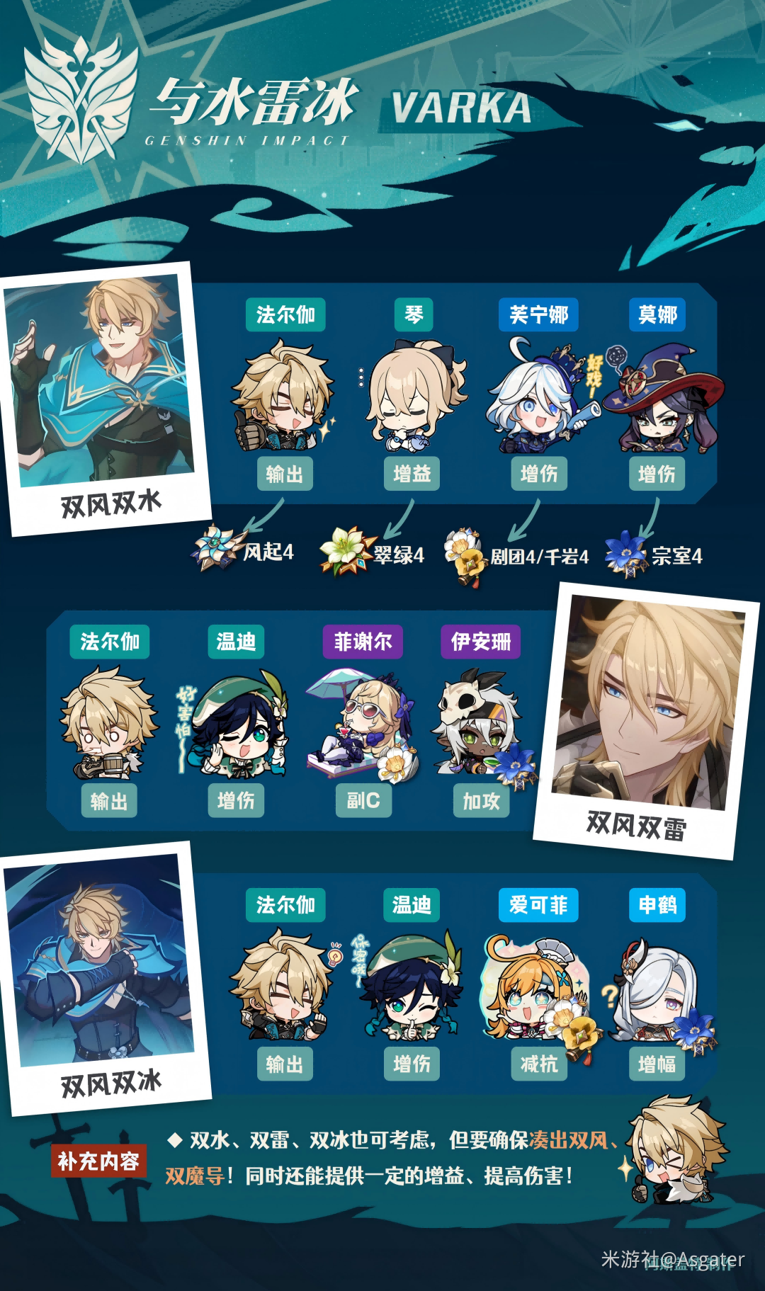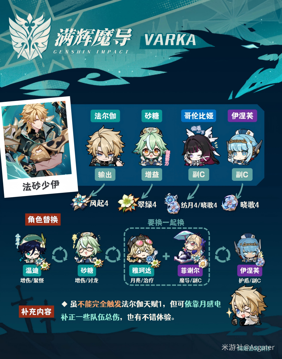 ③ 双风队友依旧可选温迪、砂糖等触发【魔导·秘仪】,若菲谢尔已入队,也能尝试万叶、4命琴、珐露珊等辅助提高法尔伽的雷或风伤。