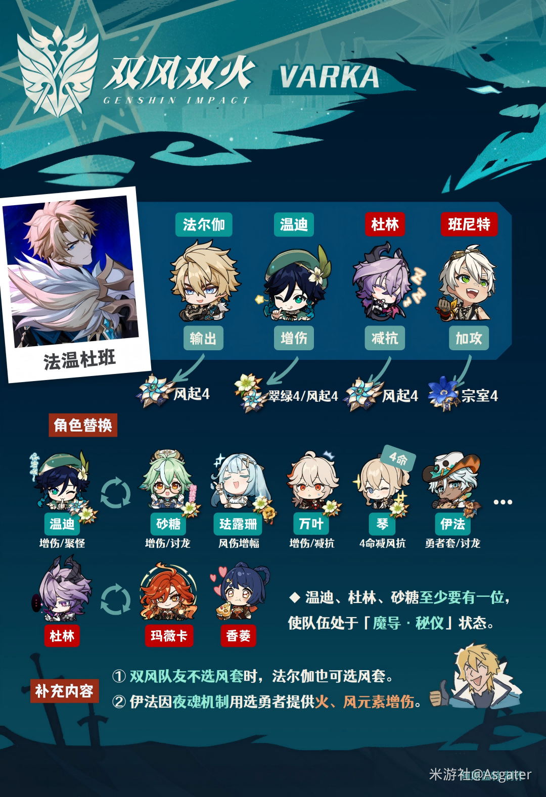 ① 魔导温迪提供聚怪、为场上触发扩散的角色提供50%增伤全属性增伤,多选【风套4】,高配风伤输出可【风起4】(此时法尔伽可风套4)。