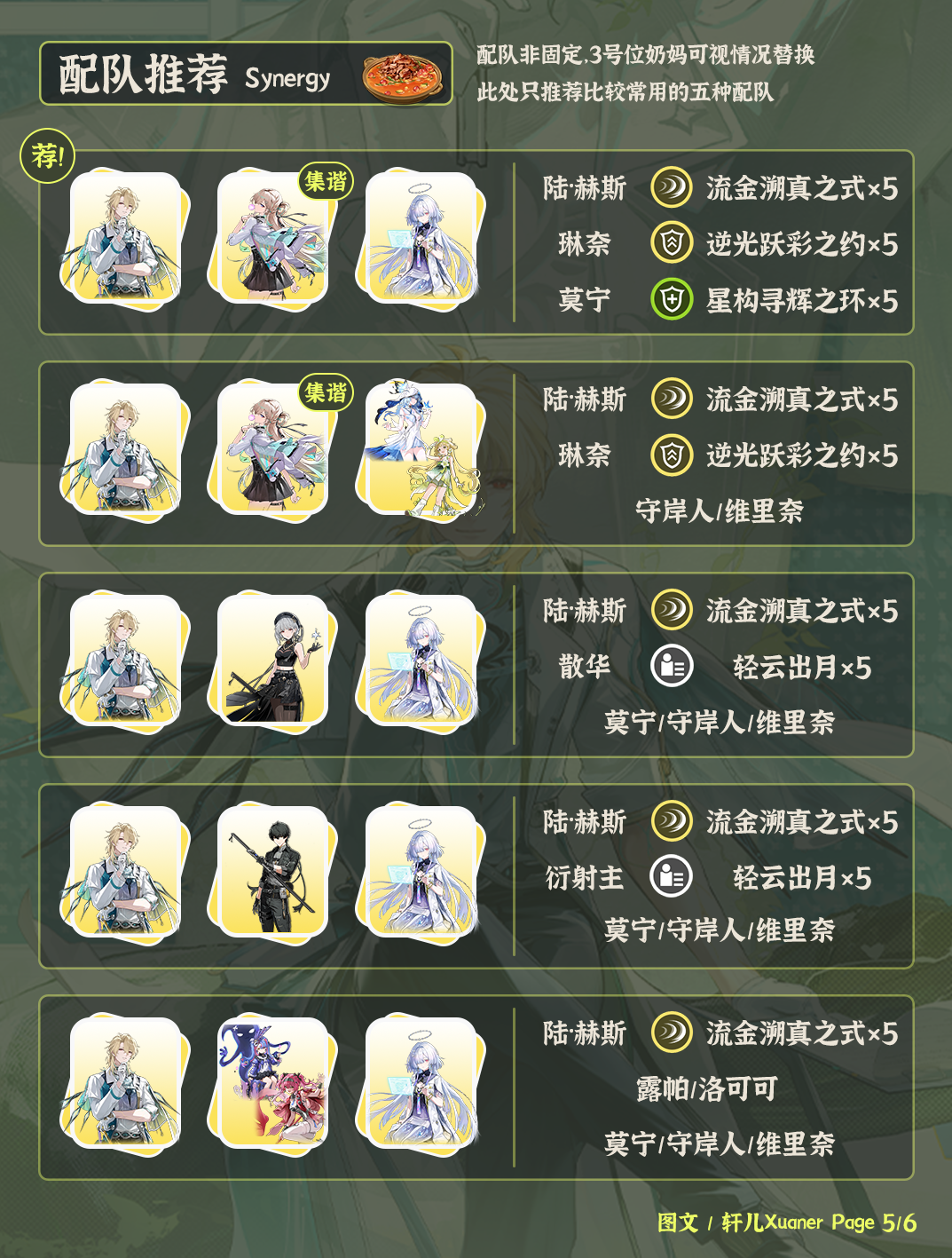 陆·赫斯是集谐普攻主C。最佳搭配是琳奈和莫宁,其中莫宁也可以换成其它奶妈。如果没有琳奈,可以考虑搭配散华/露帕/洛可可这种普攻加深副C。或者衍射主6链提供衍射减抗。配队比较亲民。
