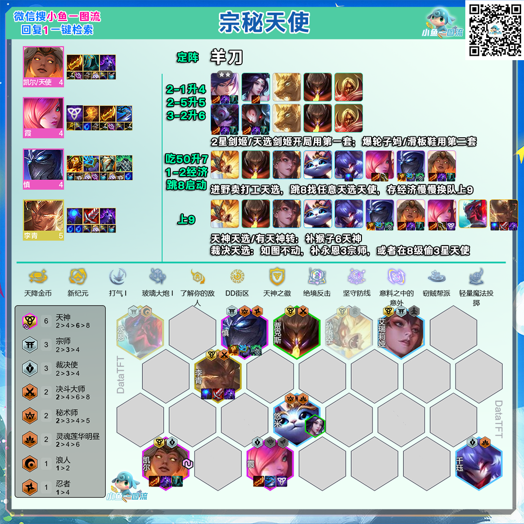天选:凯尔①天选天神,补猴子/天神转霞开6天神②天选裁决,不用改刚好4裁决,9级挂永恩3宗师