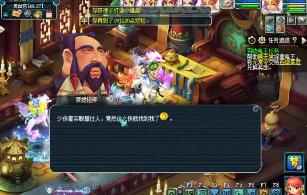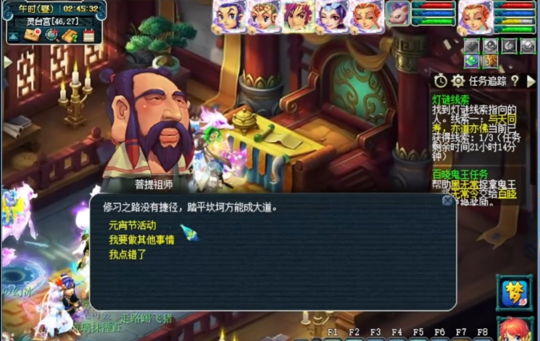 元宵节第十天(3月8日),灯谜:菩提祖师 坐标:方寸山(121,138)进入的方寸大殿内
