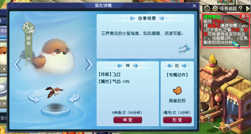 在环任务过程中,部分任务会触发彩蛋,使用“变化之卷”中指定形变可快速到达目标处,建议各位少侠提前解锁并收藏“麻雀”和“蝴蝶”形变哦!