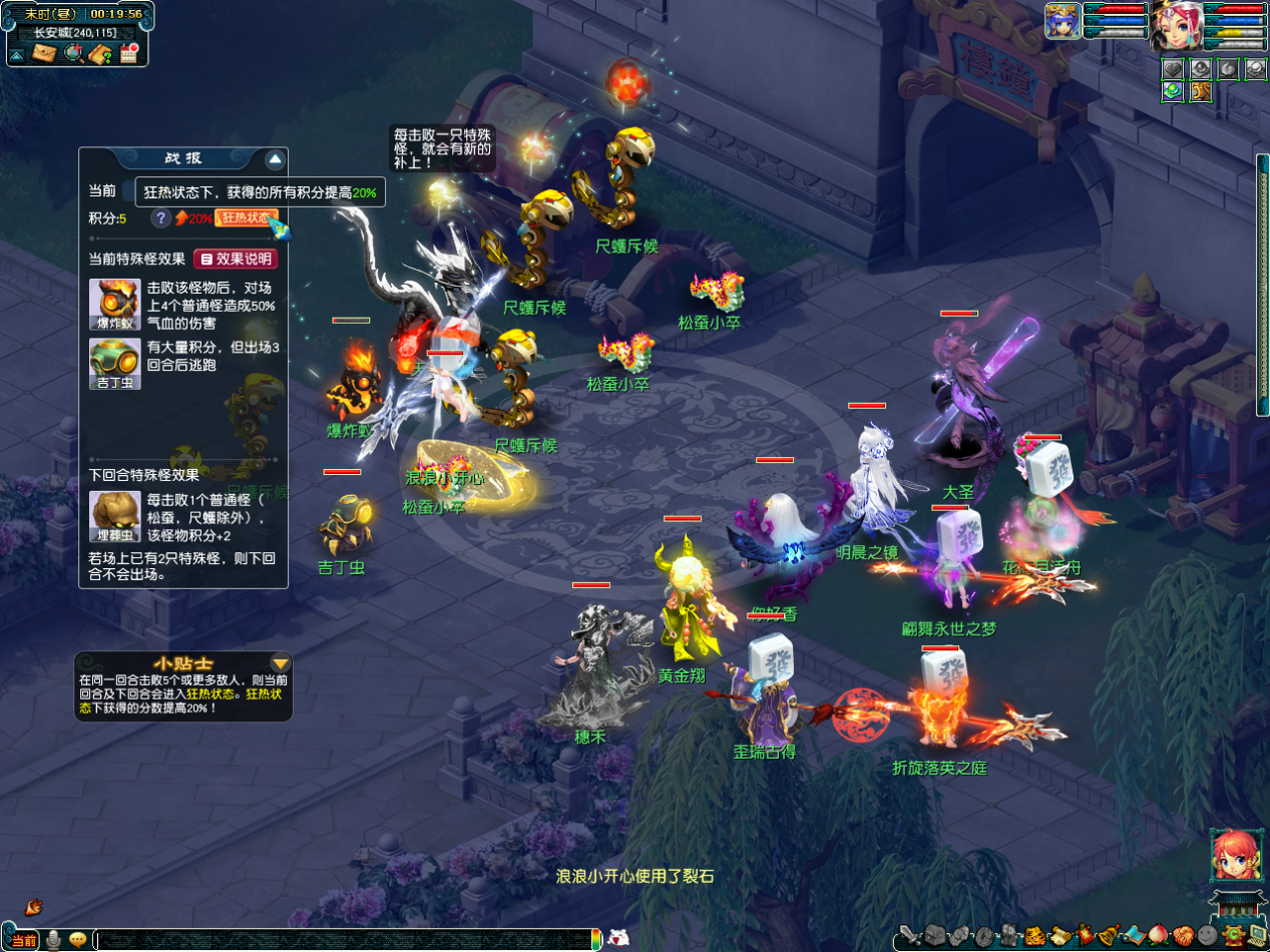 挑战玩法共持续12回合,各位少侠要在有限的时间内尽可能多地击杀怪物,若在战斗中同1回合击败5个或更多的怪物,则会进入狂热状态(获得的分数增加20%,持续到次回合,不可叠加)。