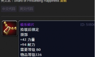 魔兽世界情人节活动中有很多有趣的节日道具,其中就包括极乐碎片,很多玩家都想知道wow极乐碎片怎么获得?下面我就给大家带来详细介绍,一起来看看吧!极乐碎片 颈部+42 力量+94 耐力需要等级80物品等级226装备: 防御等级提高41、使你的躲闪等级提高43、