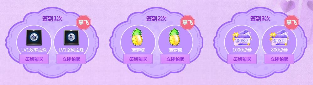 活动期间内,每周登录游戏后可在页面进行签到,每天可签到1次并领取奖励,登录掌飞可领取额外奖励。每种奖励每周可领取1份。