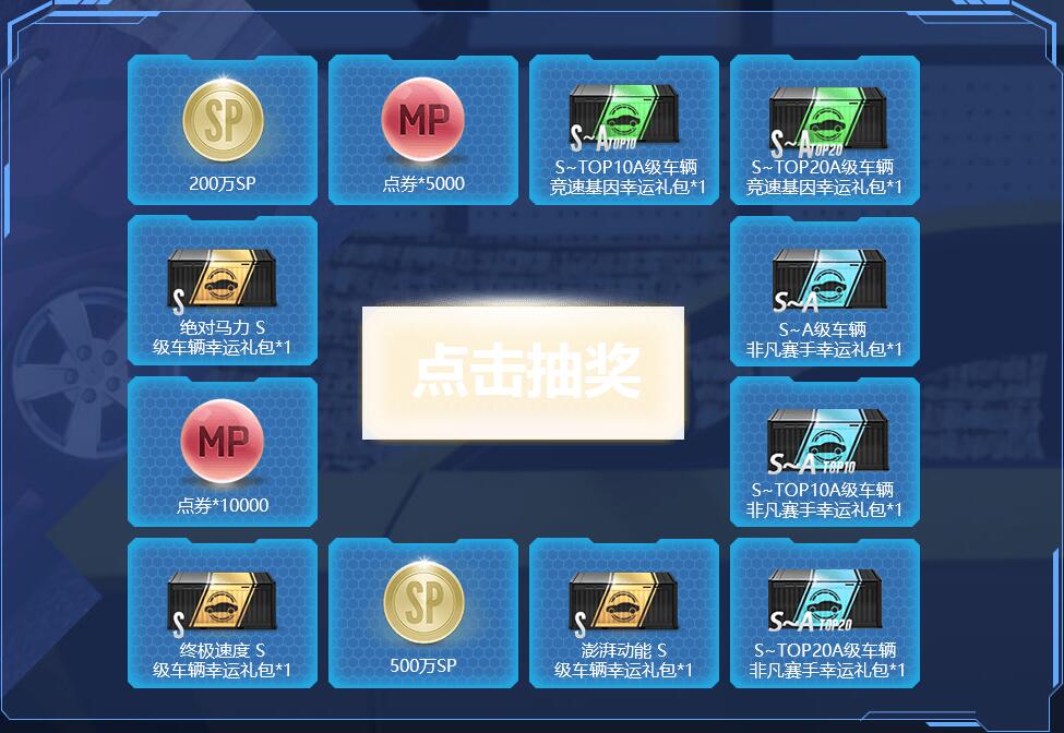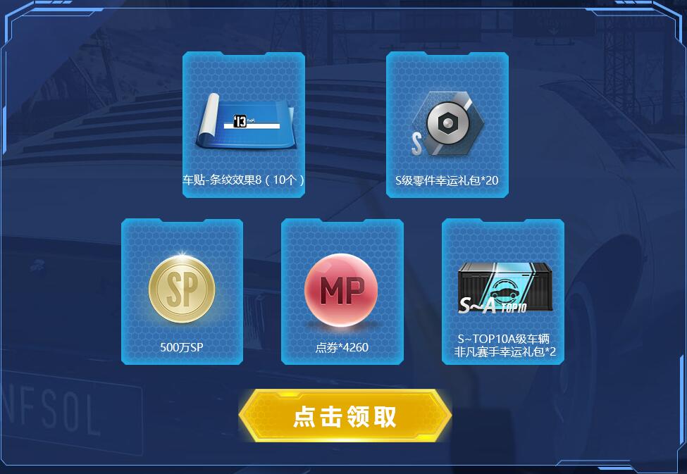 首测2周年当天4月26日登陆游戏即可领取“两周年生日礼包”哦,包含车贴-条纹效果8(10个)、S级零件幸运礼包x20、500万SP、4260点券和S~TOP10A级车辆非凡赛手幸运礼包x2。