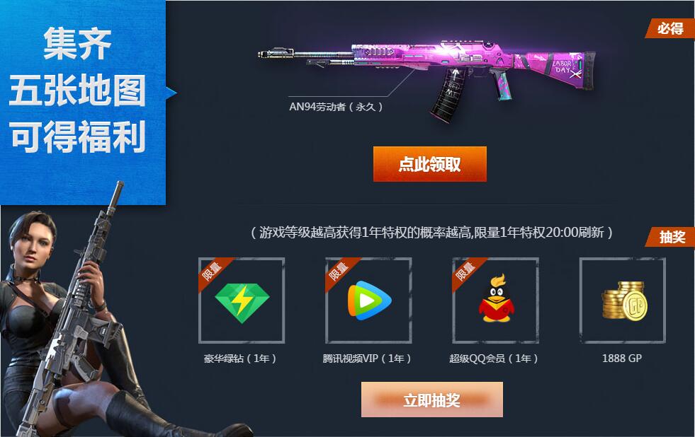 活动期间,集齐五个地图碎片,必得永久AN94劳动者!获得2/3/4个碎片还有对应福利四选一!
