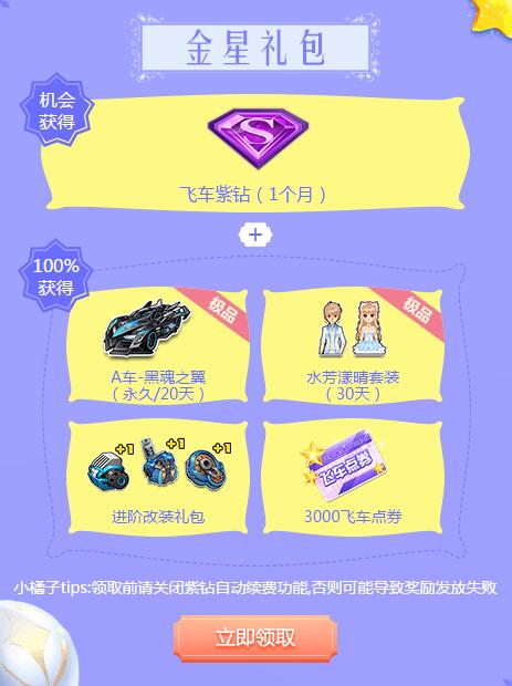 2、幸运星紫钻特权随心享:活动期间,符合身份的玩家可以领取对应身份的礼包(领取前请先关闭紫钻自动续费功能,否则可能导致奖励发放失败),单Q只可以领取其中1个礼包1次;