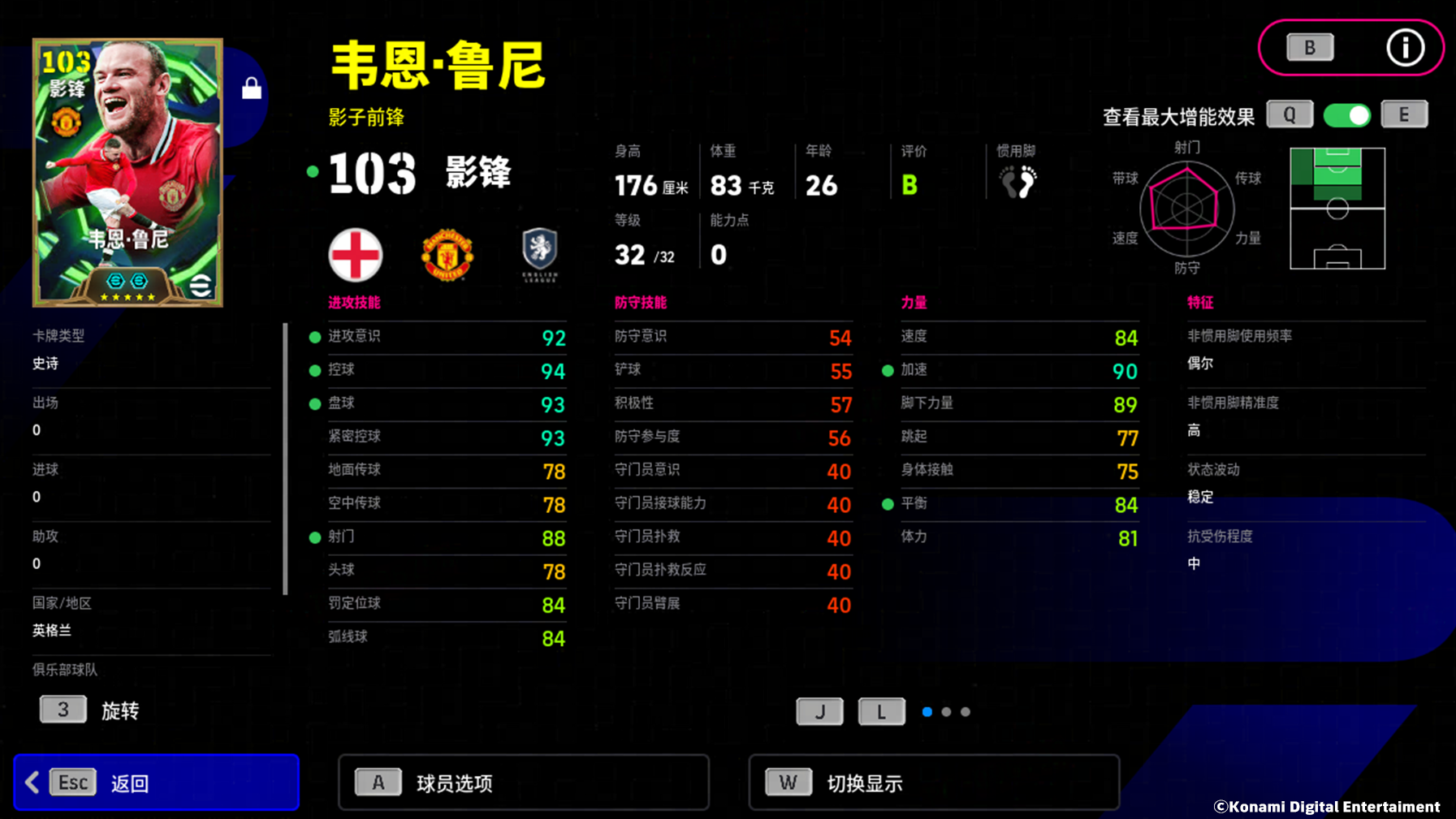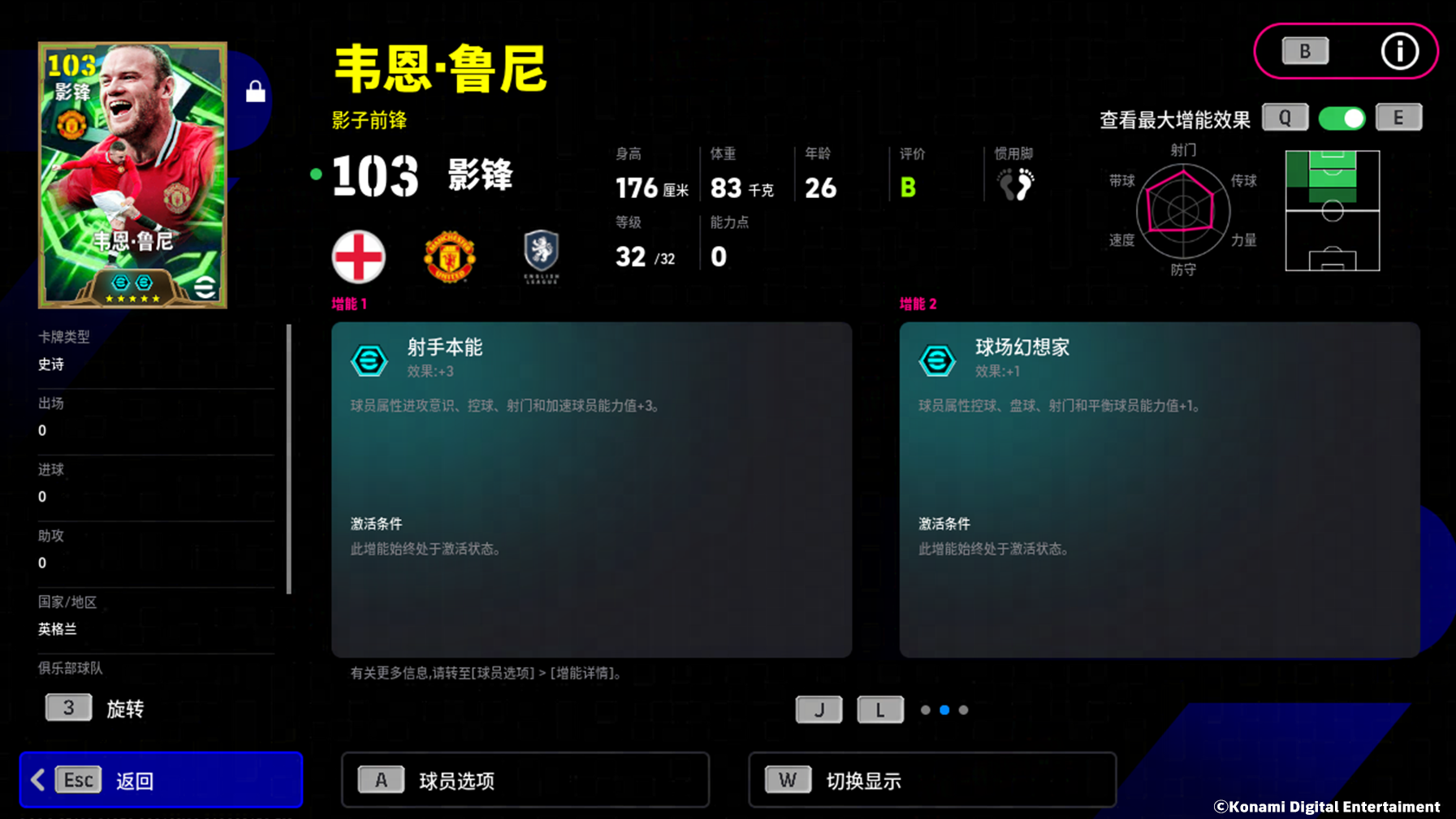 鲁尼增能属性为【射手本能 +3】,进攻能力全面增强的他化身禁区猛兽,搭配上【无定型射门】特殊技能,他在乱战中也能完成爆杆!拥有【无定型传球】技能的他更是成为战术支点,背身扛人时的一记隐蔽输送,往往便是撕裂防线的绝杀助攻!